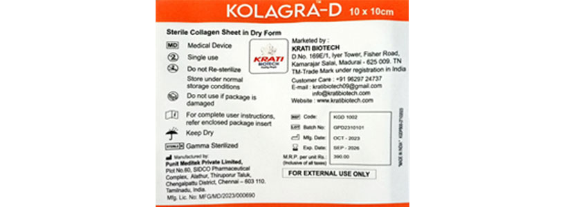The bovine collagen membrane is offered in freeze dried form to avoid pre-treatment of collagen membrane in normal saline before application. It is gamma sterilized and available in different dimensions